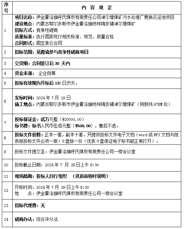 1、根據(jù)工程需要,我公司擬對伊金霍洛旗呼氏煤炭有限責任公司淖爾壕煤礦污水處理廠更換沉淀池項目進行競爭性磋商,特邀請貴單位按磋商文件規(guī)定的內(nèi)容參與投標。